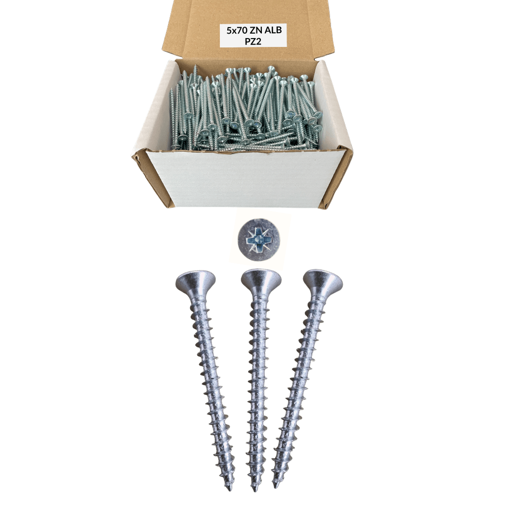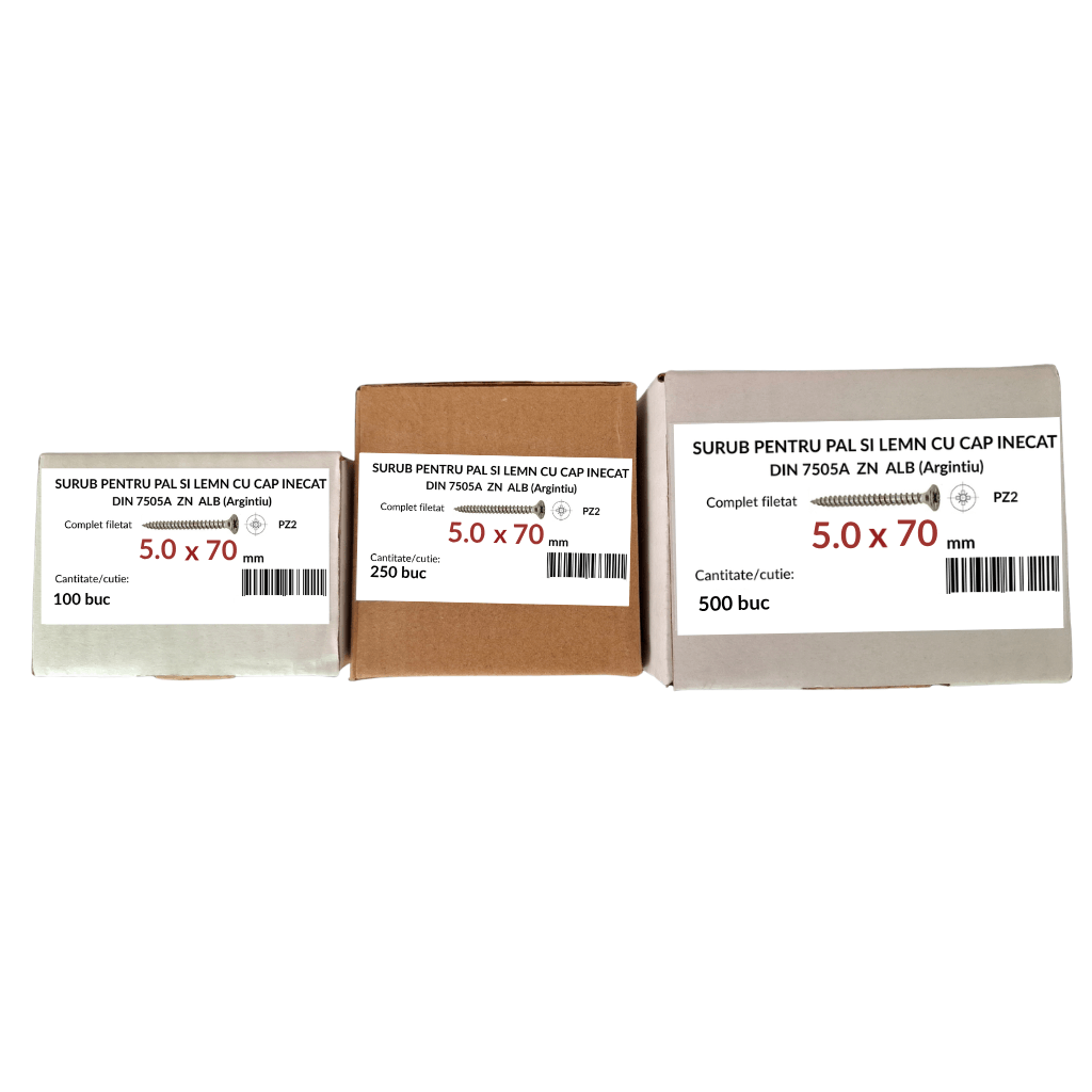 Holsuruburile 5×70 mm DIN 7505A, cu cap inecat, sunt concepute pentru fixari sigure in PAL, OSB si lemn, oferind o ancorare eficienta datorita filetului adanc si un finisaj plan prin ingroparea completa a capului, fiind ideale pentru aplicatii de mobilier unde sunt necesare precizie, durabilitate si un aspect profesional uniform.